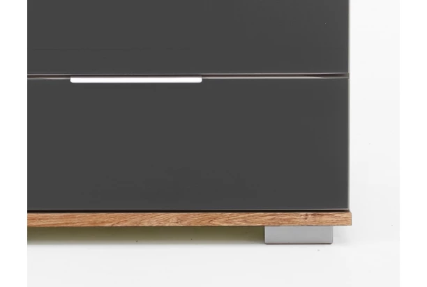 Vysoký noční stolek z programu Easy Plus nabízí 3 prostorné zásuvky nad sebou. V kombinaci dekoru prkenný dub se šedým sklem na předních plochách působí luxusně.