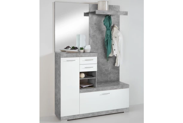 Kompaktní předsíňová stěna v módní kombinaci imitace šedého betonu a bílé barvy. Nábytek nabízí vše potřebné – botník, úložné zásuvky, odkládací přihrádky, šatní panel i zrcadlo.