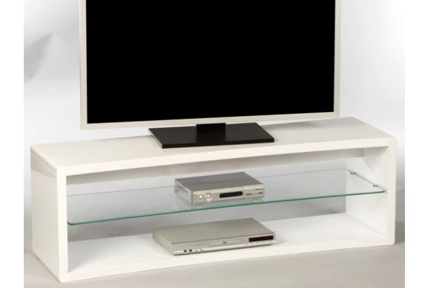Leskle bílý televizní stolek doplňuje skleněná police a extravagantně zaoblené boční strany. Dokonale se hodí do interieru s moderním lesklým nábytkem.