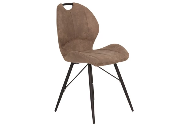 Designová jídelní židle na černé kovové podnoži má tvarovaný opěrák pro pohodlnou oporu. Židle je očalouněna látkou ve vintage optice hnědé broušené kůže.