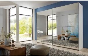 Šatní skříň o extra šířce 313 cm a extra výšce 236 cm v kombinaci bílá/světle šedá ze série Easy Plus. Velké posuvné dveře se zrcadlem umožňují snadný přístup do velkých úložných prostor, které můžete doplňovat policemi podle vaší potřeby. Skříň je vhodná do jakékoliv moderní ložnice, šatny nebo chodby.