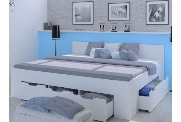 Jednoduše tvarovaná postel v bílém provedení a o rozměru lůžka 140×200 cm je navržena tak, aby se rozměrově změstila i do malé ložnice a zároveň nabídla praktické úložné prostory v podobě bočních výsuvných zásuvek, kam snadno uschováte třeba ložní prádlo nebo oblečení.