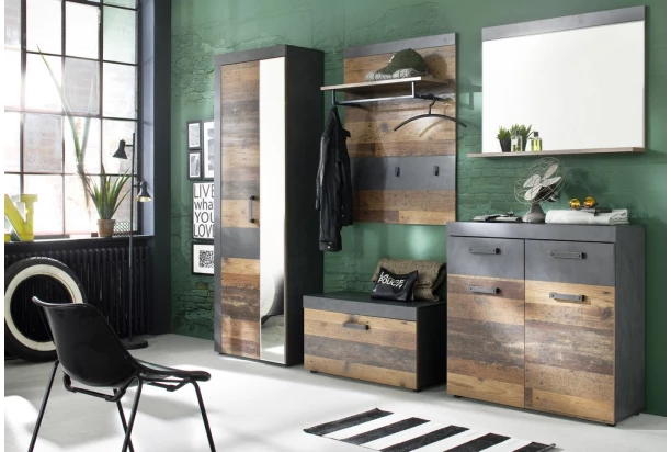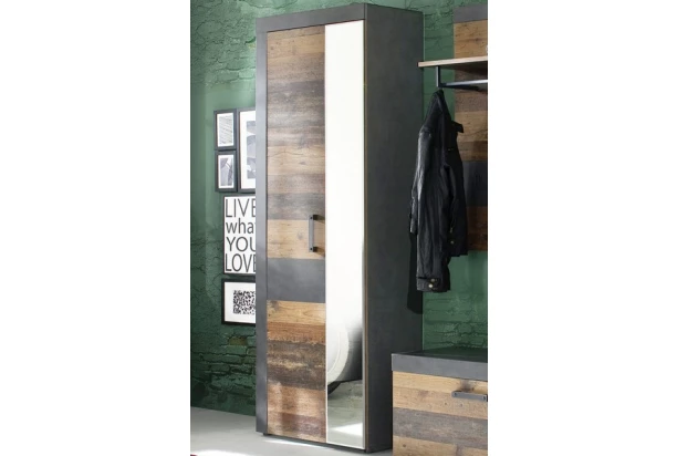 Předsíňová skříň v industriálním stylu upoutá pozornost již na pohled skvělou vintage optikou dřevěných latí a obroušeného kovu. Nábytek tak dokonale podtrhne osobitost vašeho interieru. Poskytuje univerzální vnitřní prostor pro zavěšení šatů i police pro uložení třeba obuvi.