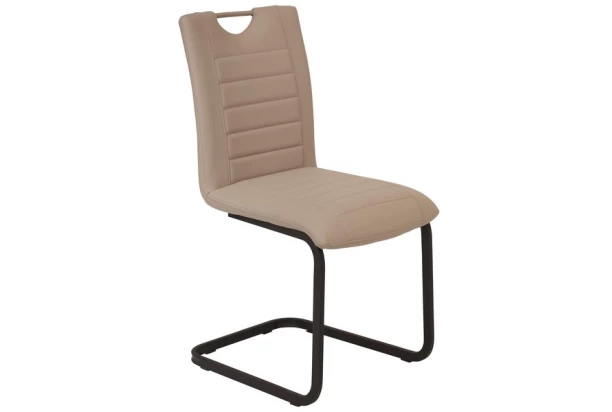 Jídelní židle na černé lakované podnoži se ideálně hodí k modernímu jídelnímu stolu. Pohodlný sedák očalouněn ekokůží v odstínu cappuccino a doplněn dekorativním proševem.