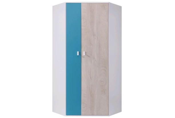 Rohová šatní skříň z programu Planet – kombinace světlého dubového dekoru, bílé a mořské modré barvy vypadá zajímavě. Nábytek je tak ideální pro zařízení dětského nebo studentského pokoje, případně i dospělých.