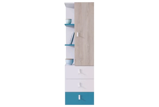 Vysoká skříňka s policemi z programu Planet – kombinace světlého dubového dekoru, bílé a mořské modré barvy vypadá zajímavě. Nábytek je tak ideální pro zařízení dětského nebo studentského pokoje, případně i dospělých.