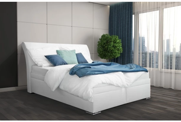 Elegantní manželská postel o rozměru lůžka 180×200 cm má zaoblený tvar zadního čela. Díky vyšší konstrukci je vstávání pohodlnější, navíc obsahuje i polohovatelné rošty. Očalouněna bílou ekokůží.