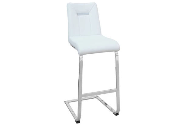 Moderní barová židle na lesklé kovové podnoži má měkce vypolstrovaný sedák potažen bílou ekokůží a doplněn proševem.
