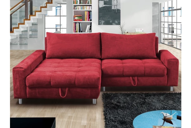 Rohová sedací souprava Kevin je ideální také do malého prostoru. I přes svou velikost nabízí kvalitní komfort, velký otoman pro pohodovou relaxaci, úložný prostor i praktickou funkci rozkladu na velmi prostorné lůžko pro dvě dospělé osoby, které lze využít také pro trvalé spaní. Očalouněna měkkou strukturovanou látkou v barvě šípkově červená. Sedačka tvoří levý roh.