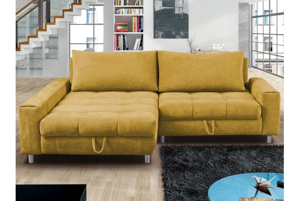 Rohová sedací souprava Kevin je ideální také do malého prostoru. I přes svou velikost nabízí kvalitní komfort, velký otoman pro pohodovou relaxaci, úložný prostor i praktickou funkci rozkladu na velmi prostorné lůžko pro dvě dospělé osoby, které lze využít také pro trvalé spaní. Očalouněna měkkou strukturovanou látkou v barvě žlutá kari. Sedačka tvoří levý roh.
