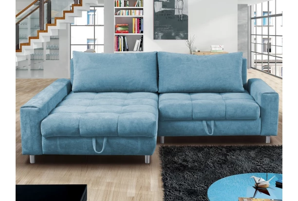 Rohová sedací souprava Kevin je ideální také do malého prostoru. I přes svou velikost nabízí kvalitní komfort, velký otoman pro pohodovou relaxaci, úložný prostor i praktickou funkci rozkladu na velmi prostorné lůžko pro dvě dospělé osoby, které lze využít také pro trvalé spaní. Očalouněna měkkou strukturovanou látkou v barvě azurově modrá. Sedačka tvoří levý roh.