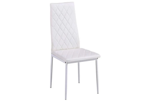 Kovová jídelní židle má sedací části očalouněny bílou ekokůží, která je navíc ozvláštněna okrasným kosočtvercovým proševem.