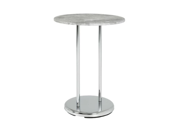 Praktický kulatý odkládací stolek v imitaci šedého betonu je na kovové podnoži v leskle chromovém provedení.