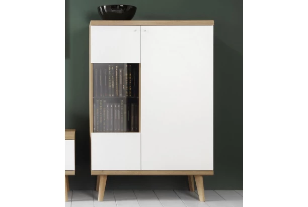 Nízká vitrína z programu Primo v příjemném skandinávském stylu. Kombinaci dubového dřevodekoru a bílé barvy doplňují zaoblené hrany a masivní nohy, které dodávají nábytku nezaměnitelný vzhled.