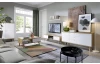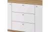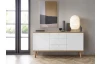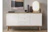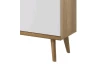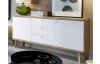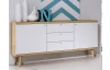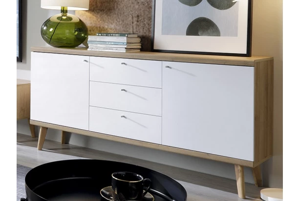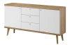 Široká komoda z programu Primo v příjemném skandinávském stylu. Kombinaci dubového dřevodekoru a bílé barvy doplňují zaoblené hrany a masivní nohy, které dodávají nábytku nezaměnitelný vzhled.