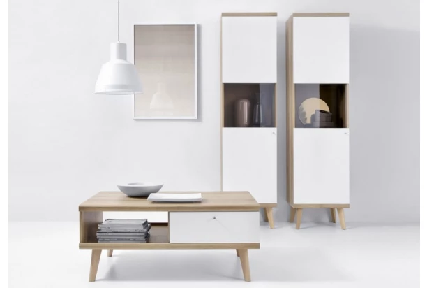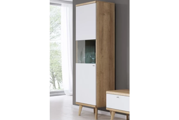 Vysoká vitrína z programu Primo v příjemném skandinávském stylu. Kombinaci dubového dřevodekoru a bílé barvy doplňují zaoblené hrany a masivní nohy, které dodávají nábytku nezaměnitelný vzhled.