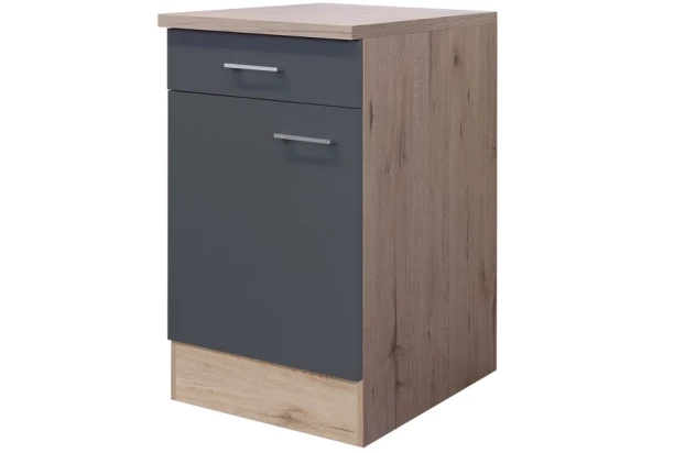 Dolní kuchyňská skříňka o šířce 50 cm z moderního kuchyňského programu Tiago – útulnou kombinaci dekoru dub san remo a šedé barvy doplňuje úchyt v šedém alu provedení. Elementy kuchyňského programu Tiago můžete mezi sebou libovolně kombinovat a sestavit si tak kuchyni podle vašich individuálních potřeb a prostorových možností.