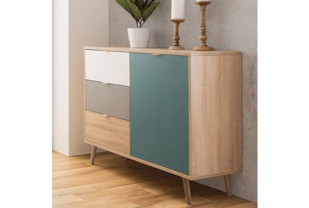 Skříňka se dveřmi a zásuvkami z programu Cuba – nábytek s nádechem skandinávského stylu je vyroben v dubovém dřevodekoru a doplněn atraktivní kombinací bílých, šedých a petrolejových ploch. Snadno si tak zařídíte byt příjemným a stylovým nábytkem, který jen tak nikdo nemá.