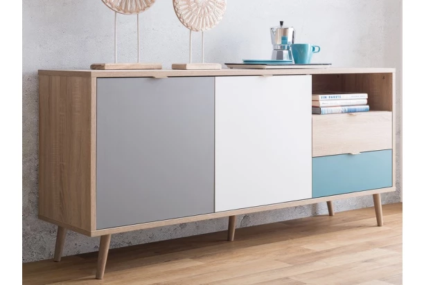 Široká úložná komoda z programu Cuba – nábytek s nádechem skandinávského stylu je vyroben v dubovém dřevodekoru a doplněn atraktivní kombinací bílých, šedých a petrolejových ploch. Snadno si tak zařídíte byt příjemným a stylovým nábytkem, který jen tak nikdo nemá.