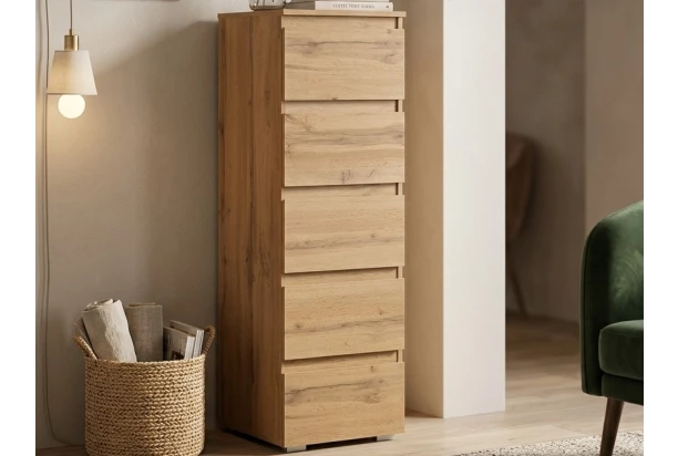 Vysoká úložná skříňka se zásuvkami z programu Image – minimalistický design nábytku je zcela univerzální a hodí se do každého moderního interiéru. Atraktivní dřevodekor v odstínu medového dubu dodává nábytku příjemně hřejivý a útulný vzhled. Tato vysoká komoda nabízí praktické šuplíky pro univerzální ukládání různých věcí.