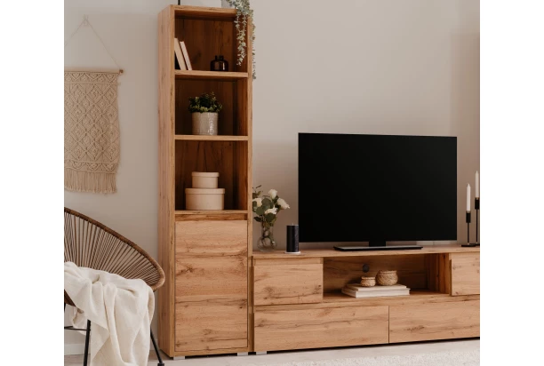 Regál s dvířky o šířce 45 cm z programu Image – minimalistický design nábytku je zcela univerzální a hodí se do každého moderního interiéru. Atraktivní dřevodekor v odstínu medového dubu dodává nábytku příjemně hřejivý a útulný vzhled. Za otočnými dvířky se skrývá praktický úložný prostor s policí, který vám pomůže udržet pořádek v domácnosti.