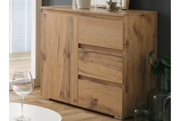 Komoda se zásuvkami z programu Image – minimalistický design nábytku je zcela univerzální a hodí se do každého moderního interiéru. Atraktivní dřevodekor v odstínu medového dubu dodává nábytku příjemně hřejivý a útulný vzhled. Tato skříňka nabízí praktické zásuvky i úložný prostor s policí za otočnými dvířky pro univerzální ukládání věcí.