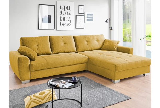 Dopřejte si pohodlí, kvalitu i trendovní styl zároveň. Rohová sedací souprava s komfortním vypolstrováním zaujme dekorativním proševem sedáku i polštářů. Univerzální otoman lze umístit vpravo nebo vlevo a přizpůsobit si tak sedačku prostorovým možnostem. Včetně rozkládací funkce i úložného prostoru pod otomanem. Sedačka je očalouněna žlutou látkou, která je příjemně měkká na dotek.