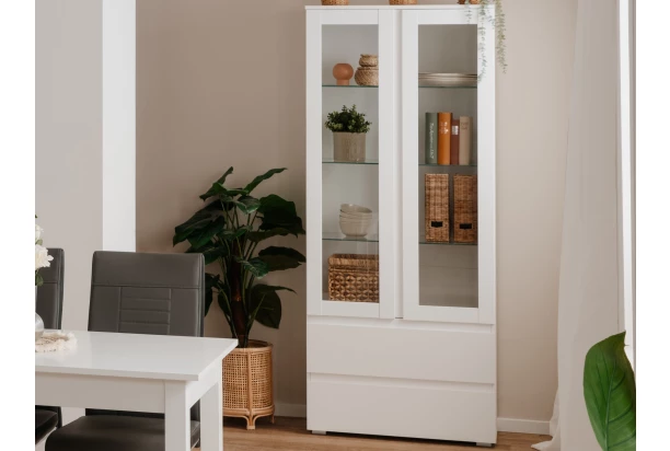 Vysoká vitrína z programu Image – minimalistický design nábytku je zcela univerzální a hodí se do každého moderního interiéru. Vitrína o šířce 80 cm má 2 zásuvky a 3 skleněné police, kam můžete vystavit dekorace, fotky anebo třeba skleničky.