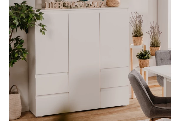 Vysoká komoda se zásuvkami z programu Image – minimalistický design nábytku je zcela univerzální a hodí se do každého moderního interieru. Tato skříňka obsahuje šuplíky a za otočnými dveřmi najdete úložný prostor s policemi pro univerzální ukládání věcí.