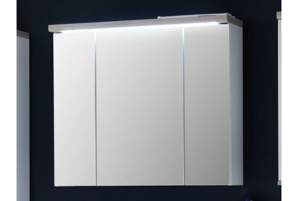 Koupelnová skříňka se zrcadlem z kolekce Country – univerzální skříňka se zrcadlem na všech třech dveřích. V dřevodekoru bělené pinie s dubem nelson. Navíc s osvětlením v horní liště.