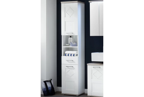 Vysoká koupelnová skříňka z kolekce Country – nábytek ve venkovském duchu doplňuje tradiční okrasné lišty předních ploch. V dřevodekoru bělené pinie s dubem nelson.