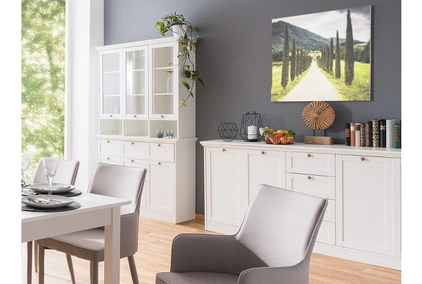 Široká úložná vitrína z programu Landwood – tradičně bílý nábytek s okrasnou římsou v romantickém venkovském stylu. Vytvářejte si tak snadno půvabné interiery s nádechem tradice a kouzlem atmosféry venkova.