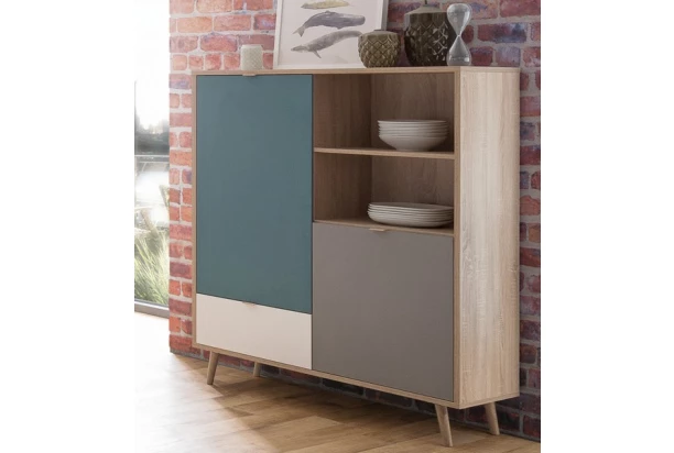 Vysoká úložná skříňka z programu Cuba – nábytek s nádechem skandinávského stylu je vyroben v dubovém dřevodekoru a doplněn atraktivní kombinací bílých, šedých a petrolejových ploch. Snadno si tak zařídíte byt příjemným a stylovým nábytkem, který jen tak nikdo nemá.