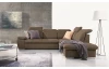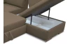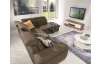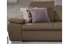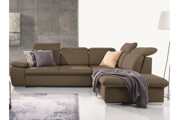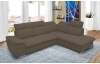Elegantní rohová sedací souprava s komfortně měkkým sezením a polohovatelnými opěrkami hlavy nabízí skvělé pohodlí i praktičnost. Varianta s otomanem vpravo. Očalouněna tkaninou v hnědém odstínu.