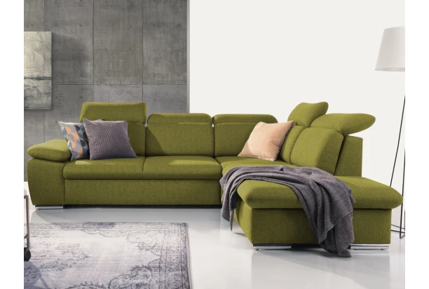 Elegantní rohová sedací souprava s komfortně měkkým sezením a polohovatelnými opěrkami hlavy nabízí skvělé pohodlí i praktičnost. Varianta s otomanem vpravo. Očalouněna tkaninou v zeleném odstínu.