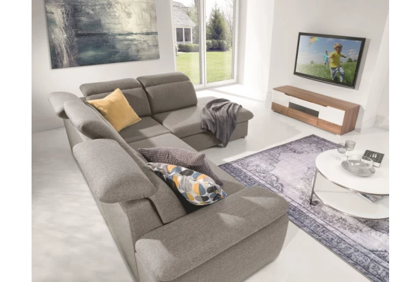 Elegantní rohová sedací souprava s komfortně měkkým sezením a polohovatelnými opěrkami hlavy nabízí skvělé pohodlí i praktičnost. Varianta s otomanem vpravo. Očalouněna tkaninou v béžovém odstínu.