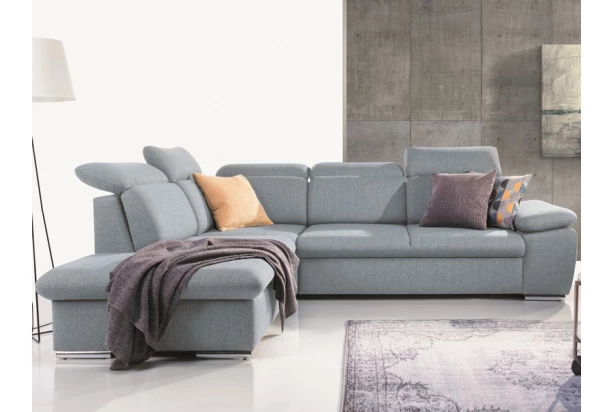 Elegantní rohová sedací souprava s komfortně měkkým sezením a polohovatelnými opěrkami hlavy nabízí skvělé pohodlí i praktičnost. Varianta s otomanem vlevo. Očalouněna tkaninou ve světlém platinově šedém odstínu.