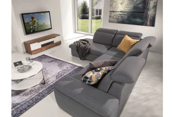 Elegantní rohová sedací souprava s komfortně měkkým sezením a polohovatelnými opěrkami hlavy nabízí skvělé pohodlí i praktičnost. Varianta s otomanem vlevo. Očalouněna tkaninou v kouřově šedém odstínu.