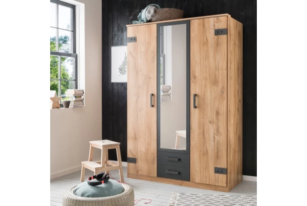 Praktická šatní skříň se zrcadlem a zásuvkami o šířce 135 cm je inspirována industriálním stylem. Dekor prkenného dubu a grafitu doplňují dekorační kovové aplikace, které skříni dodávají zajímavější optiku.