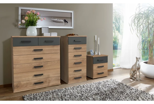 Komoda se zásuvkami má celkovou šířku 91 cm a je inspirována industriálním stylem. Dekor prkenného dubu a grafitu doplňují úchyty v imitaci tmavého kovu a šroubů, které skříňce dodávají zajímavější optiku. Tato praktická zásuvková skříňka najde místo v ložnici, obýváku i třeba pracovně pro přehledné ukládání věcí nebo drobného prádla.
