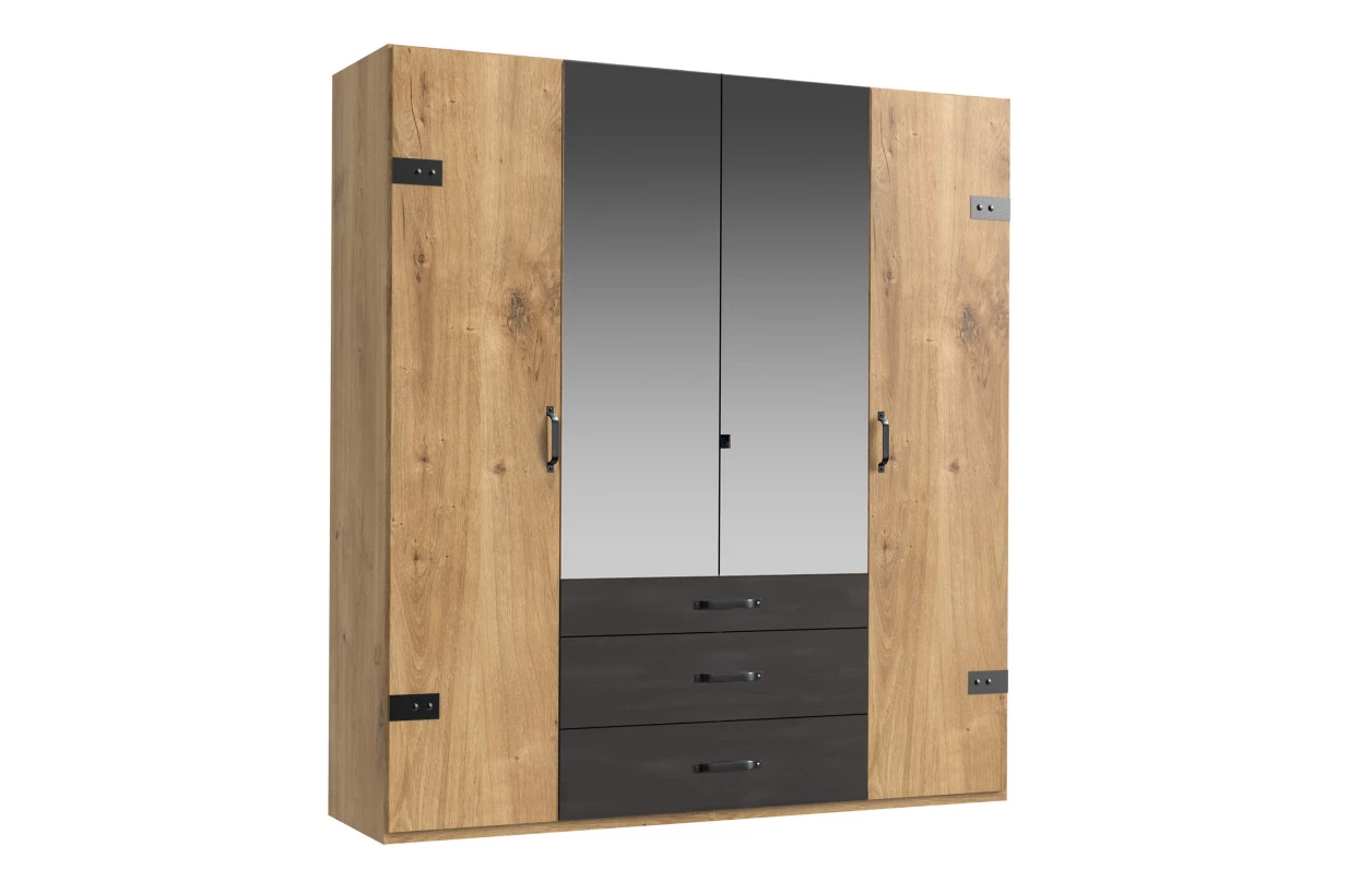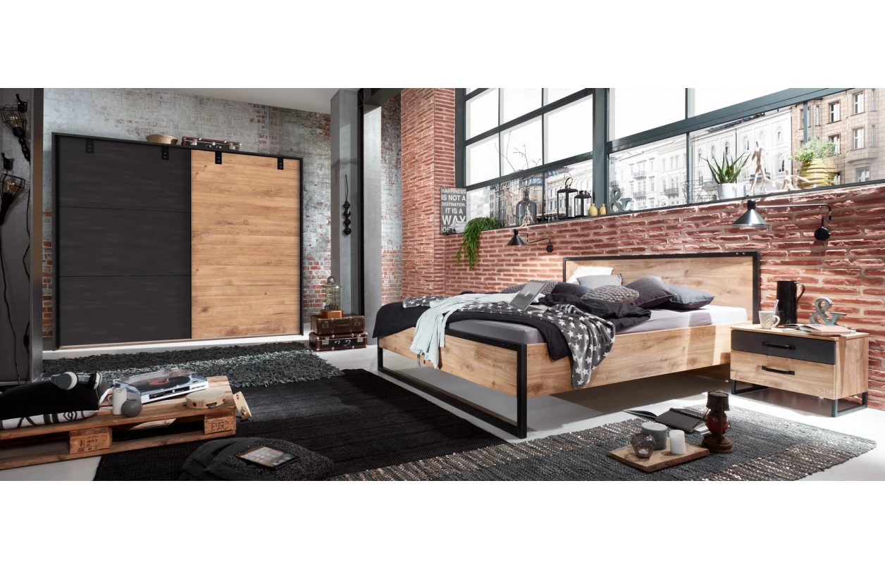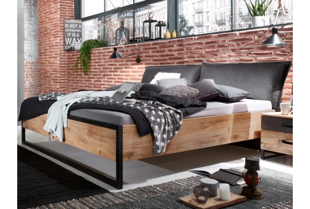 Dvoulůžková postel o velikosti 180×200 cm z kolekce Detroit – inspirujte se městským industriálním stylem a buďte prostě in. Útulné tóny dřevodekoru prkenný dub doplňuje komfortně vypolstrované zádové čelo v antracitové vintage optice kůže a černá podnož, díky které nábytek působí velmi vzdušně.