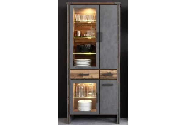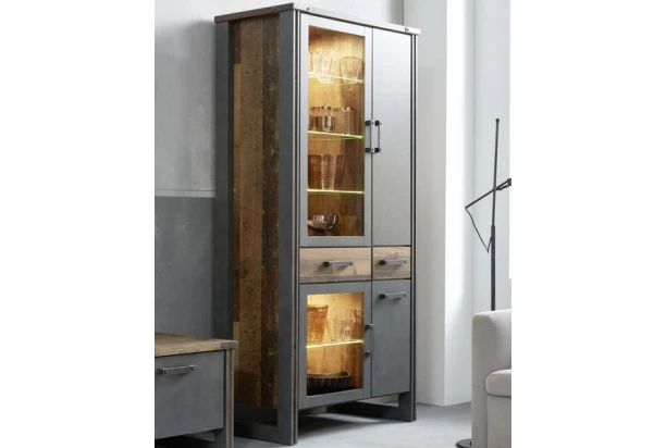 Vysoká vitrína z kolekce Prime v industriálním stylu upoutá pozornost již na pohled skvělou vintage optikou dřevěných latí a obroušeného kovu. Nábytek tak dokonale podtrhne osobitost vašeho interieru.