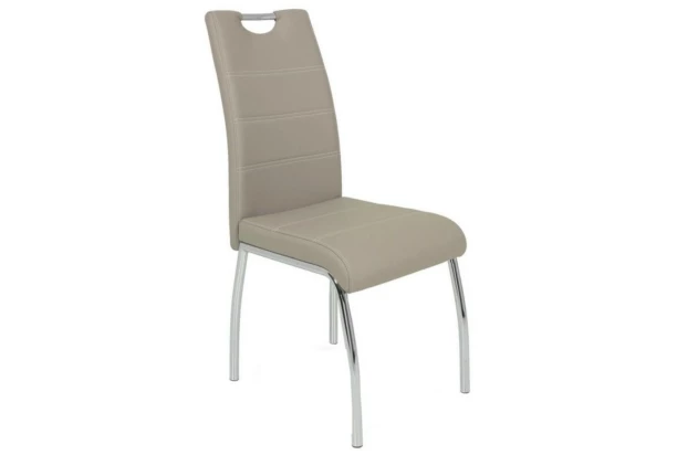 Moderní jídelní židle na chromově lesklé podnoži je zakončena praktickým madlem. Potah z ekokůže v odstínu šedé cappuccino doplňuje dekorativní prošev.