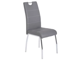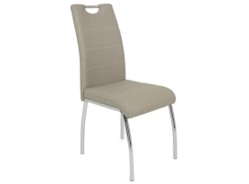 Moderní jídelní židle na chromově lesklé podnoži je zakončena praktickým madlem. Potah z ekokůže v odstínu šedo-hnědé latté doplňuje dekorativní prošev.
