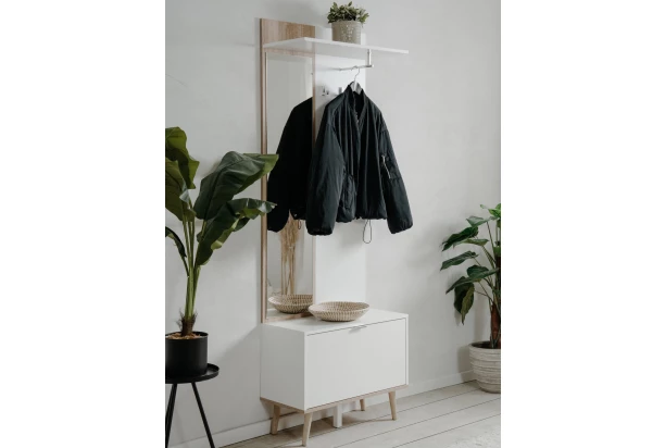 Předsíňová stěna z kolekce Göteborg v oblíbeném skandinávském stylu – čisté bílé linie nábytku podtrhují masivní dřevěné nožky s útulným dubovým dřevodekorem, díky kterým působí nábytek vzdušně a zároveň velmi elegantně. Předsíňová stěna obsahuje zrcadlo, botník i šatní panel s policí a věšáky pro zavěšení svrchního oblečení, kabelky nebo doplňků.