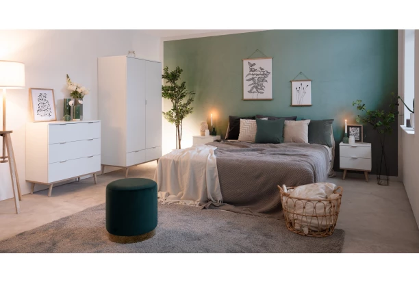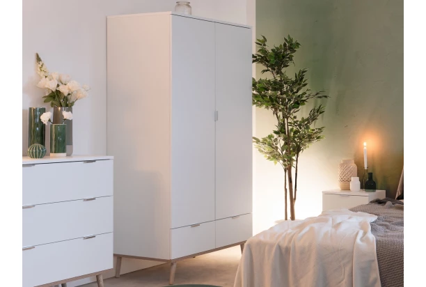 Šatní skříň z kolekce Göteborg v oblíbeném skandinávském stylu – čisté bílé linie nábytku podtrhují masivní dřevěné nožky s útulným dubovým dřevodekorem, díky kterým působí nábytek vzdušně a zároveň velmi elegantně.