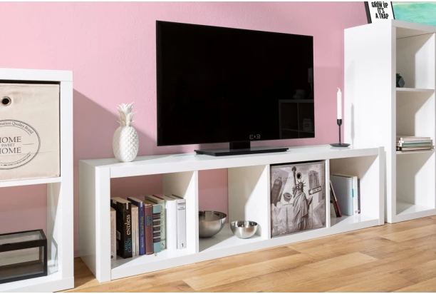 Regál se širokým rámem a 4 otevřenými přihrádkami v uspořádání 1×4 najde využití v každé místnosti bytu. Vyroben v kombinaci bílý lesk/bílý mat. Regál lze umístit výšku anebo na šířku a využít ho i jako TV stolek. Přihrádky regálu můžete navíc libovolně doplnit úložnými boxy.