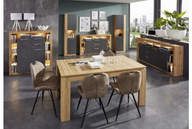 Prostorný jídelní stůl Universal má funkci rozkladu, pevnou konstrukci a oblíbenou optiku širokých rámů. Pro moderní i klasicky zařízený interier. Vyroben v útulném dekoru dub wotan.