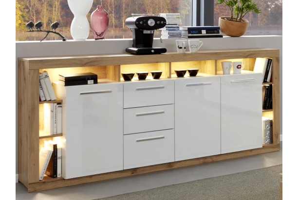 Široká komoda o extra šířce 200 cm z kolekce Rock – nábytek pro všechny, kdo mají rádi moderní styl. V útulném dřevodekoru dub wotan v kombinaci leskem bílých předních ploch. Z jednotlivých elementů nábytkové řady Rock lze zařídit celý obývací pokoj i jídelnu.