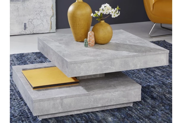 Konferenční stolek v moderním designu má otočnou horní plochu, kterou si můžete přizpůsobit podle aktuální potřeby anebo vkusu. Vyroben v imitaci šedého betonu.